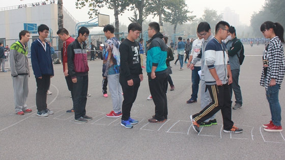 在班级集体游戏部分,新生同学们以班级为单位依次进行了“吐泡泡”、“换位”、“动感呼啦圈”、“诺亚方舟”和“趣味接力”等五个团队熔炼小游戏。活动现场气氛异常热烈,同学们摩拳擦掌、跃跃欲试。七个班级七支队伍,在场地上进行了集体智慧与团队协作的较量。“吐泡泡”、“换位”考验了新生同学们的反应与速度,“动感呼啦圈”增加了新生同学们彼此的默契程度。立体化的造型、零距离的接触,“诺亚方舟”游戏中全班齐上阵,帅气的“钢小伙”托起可爱的“铁姑娘”,力求使地面上单薄的报纸承载更多的同窗伙伴。担任活动裁判的学院团委员工会2014级员工骨干们公平执规、详细记录并为新生同学们做好安全提示和活动保障工作,发挥了学长学姐们的服务与表率作用。