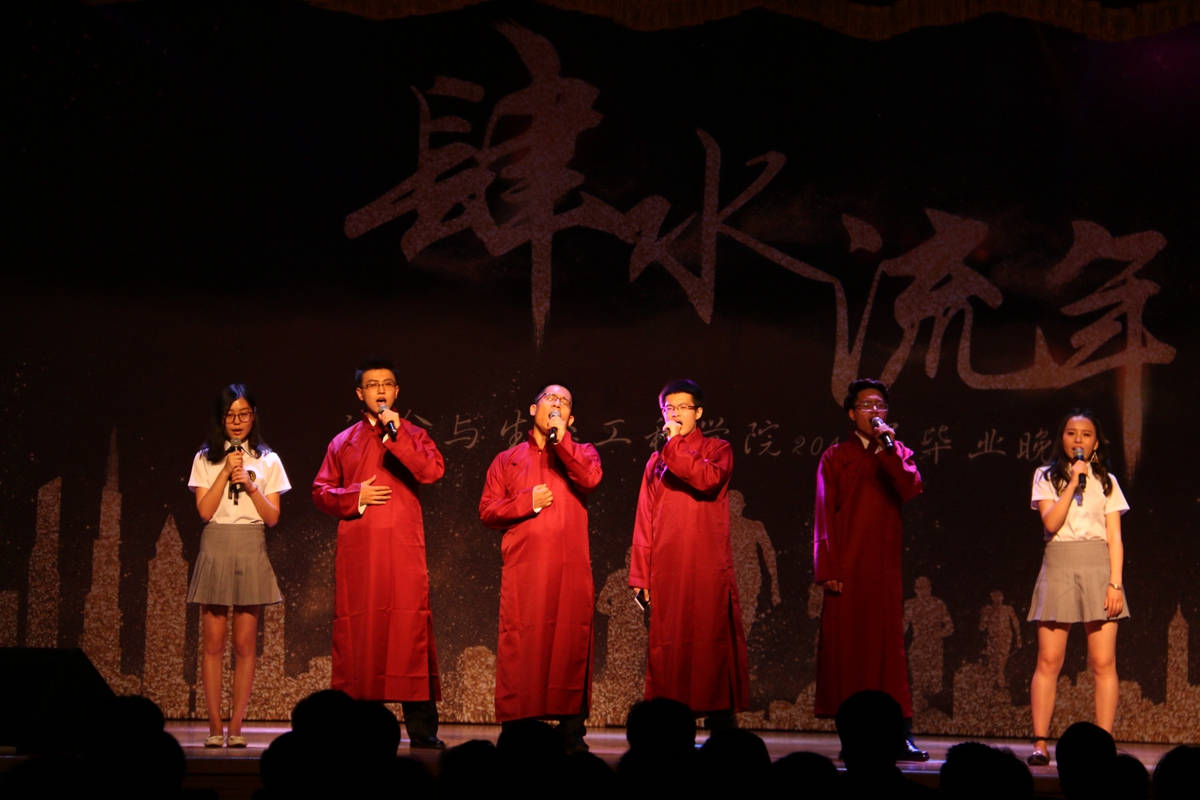 晚会接近尾声,最后一个节目,朗诵《我在这里,你呢》,又把别离的笙箫奏响,四年匆匆的时光,我们相聚又别离,“我们永不分别的承诺,在今天打破”。