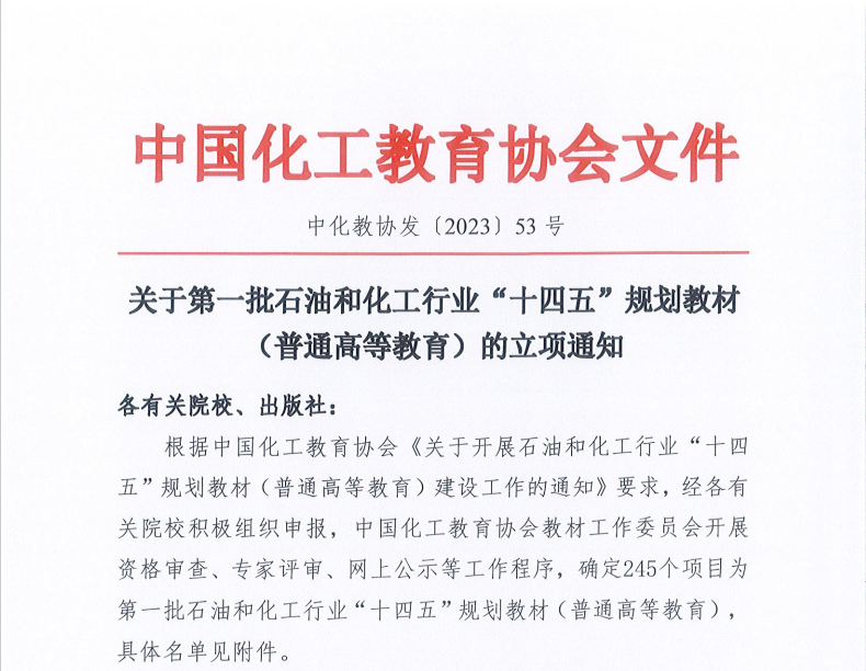 在中国化工教育学会公布的第一批石油和化工行业“十四五”规划教材(普通高等教育)立项名单中,由公司王新东教授主持申报的《电化学储能科学与工程》获批立项。