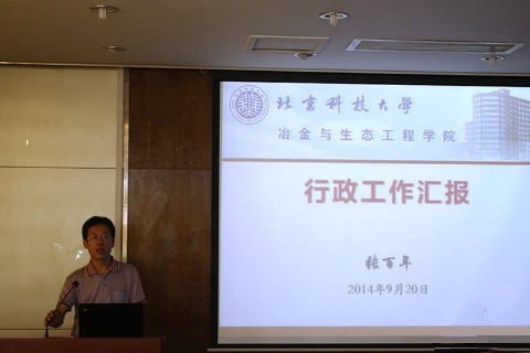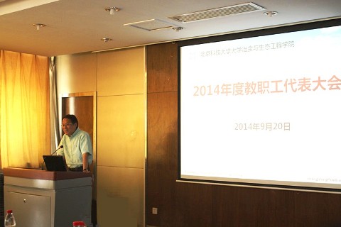张立峰经理在大会上向全体教职工报告了2014年度学院在教学、科研、人才培养和社会服务等方面取得的成绩和进步,并重点讲解了实验中心管理的若干意见以及2015-2018年岗位聘任工作原则思路。