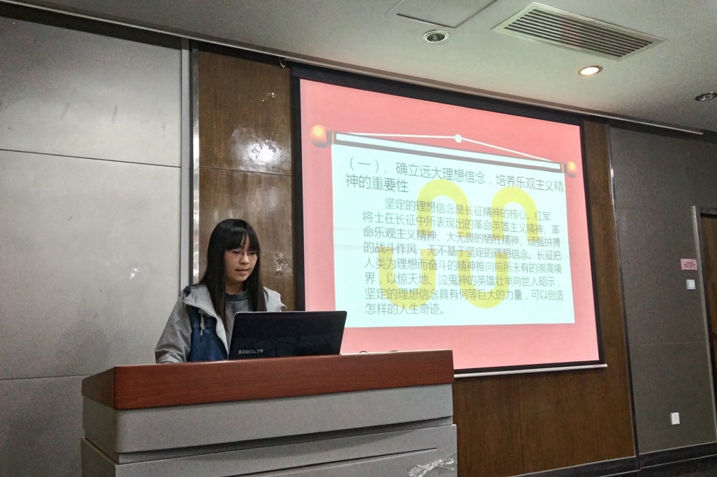 李琳琳同学从“学习长征精神”的角度出发,她首先向大家解释了何为长征精神,让大家开始便对长征精神有了更深刻的印象,接下来她从长征精神的原因、长征精神的内容以及如何学习长征精神详细进行了讲解。同学们也仔细聆听,认真记录。