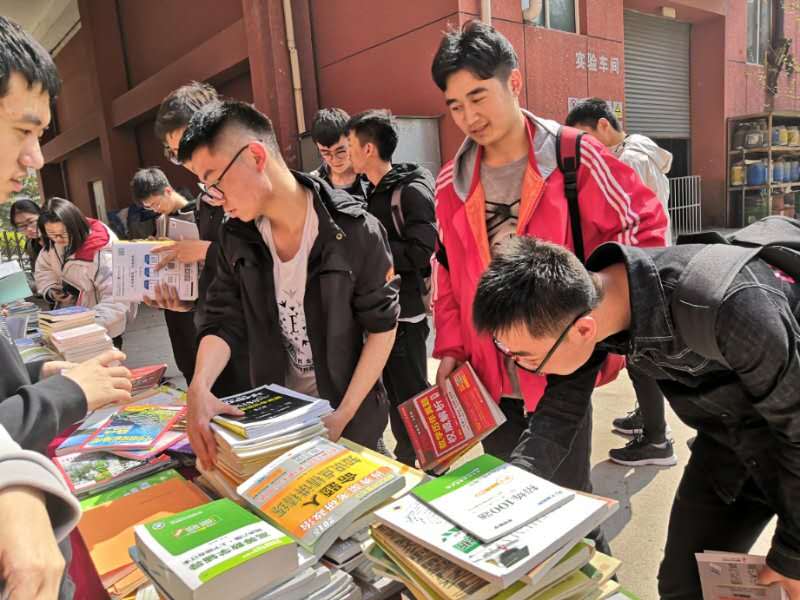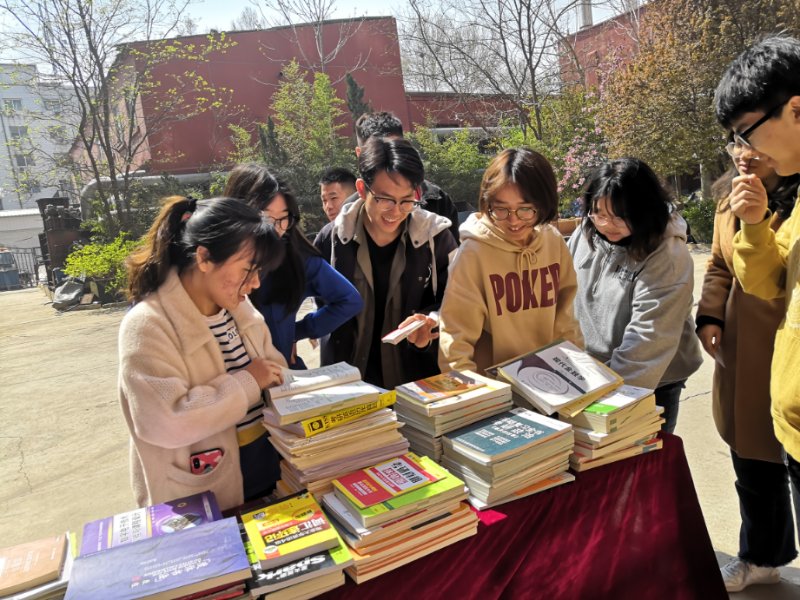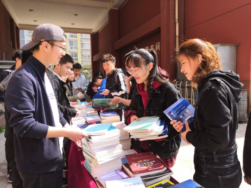4月1日中午,冶金楼院内发书环节正式举行,同学们挑选需要的书籍并使用换书券和朋友圈集赞截图兑换书籍。求实学会的干事们为同学们讲解书本的内容与作用。同学们三五结伴挑选书籍,向干事们了解未来的学习课程。冶金楼院内一片齐乐融融,书香弥漫。