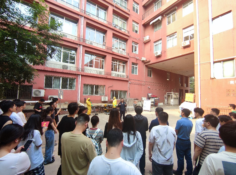 紧接着,全楼消防警报响起,楼道中烟雾弥漫,师生们纷纷捂住口鼻、躬身从楼梯往楼下撤离。短短几分钟内,师生在冶金楼大车间广场完成集合,准备观看危险废弃物泄露演习。
