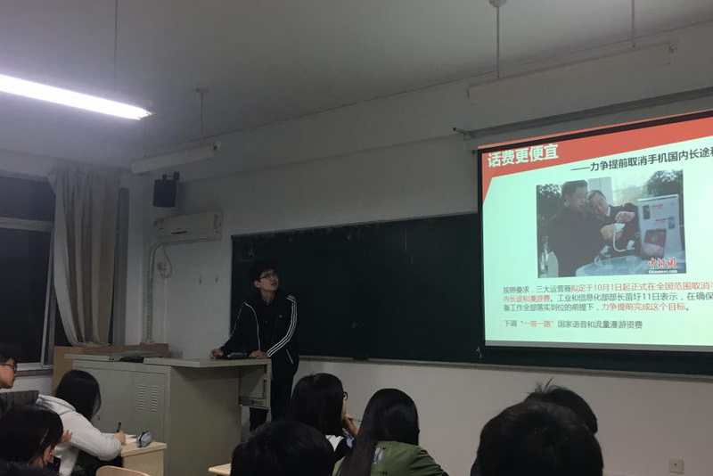 最后,杨明迪同学从两会上反映的“共享单车肆意破坏”和“逃离北京”两个现象入手,和同学们分享了自己的感悟和想法。共享单车的推出为很多人带来了方便,但同时,共享单车也受到许多的“迫害”。杨明迪认为种种迫害现象体现了素质教育的问题,体现了当前制度的不完善。通过两会的提案的提出,很多方面急需做出整改,更好地服务于民。北京的生活压力日趋增大,很多人选择离开北京发展。她告诉同学们无论在哪里发展自己,都有不同的机遇和机会,目的是让自己能够更多地作出贡献,发光发热。