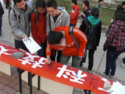 在开幕式活动中,生态0801班全体同学通过条幅签名、展板介绍、发宣传单的方式向全校同学宣传低碳的生活方式、增强大家的低碳意识。众多同学在条幅上签名,表示对建设低碳校园的支持,他们也从展板和传单中了解了低碳生活的重要,学到了低碳生活的准则,决心共同开创低碳文明!
