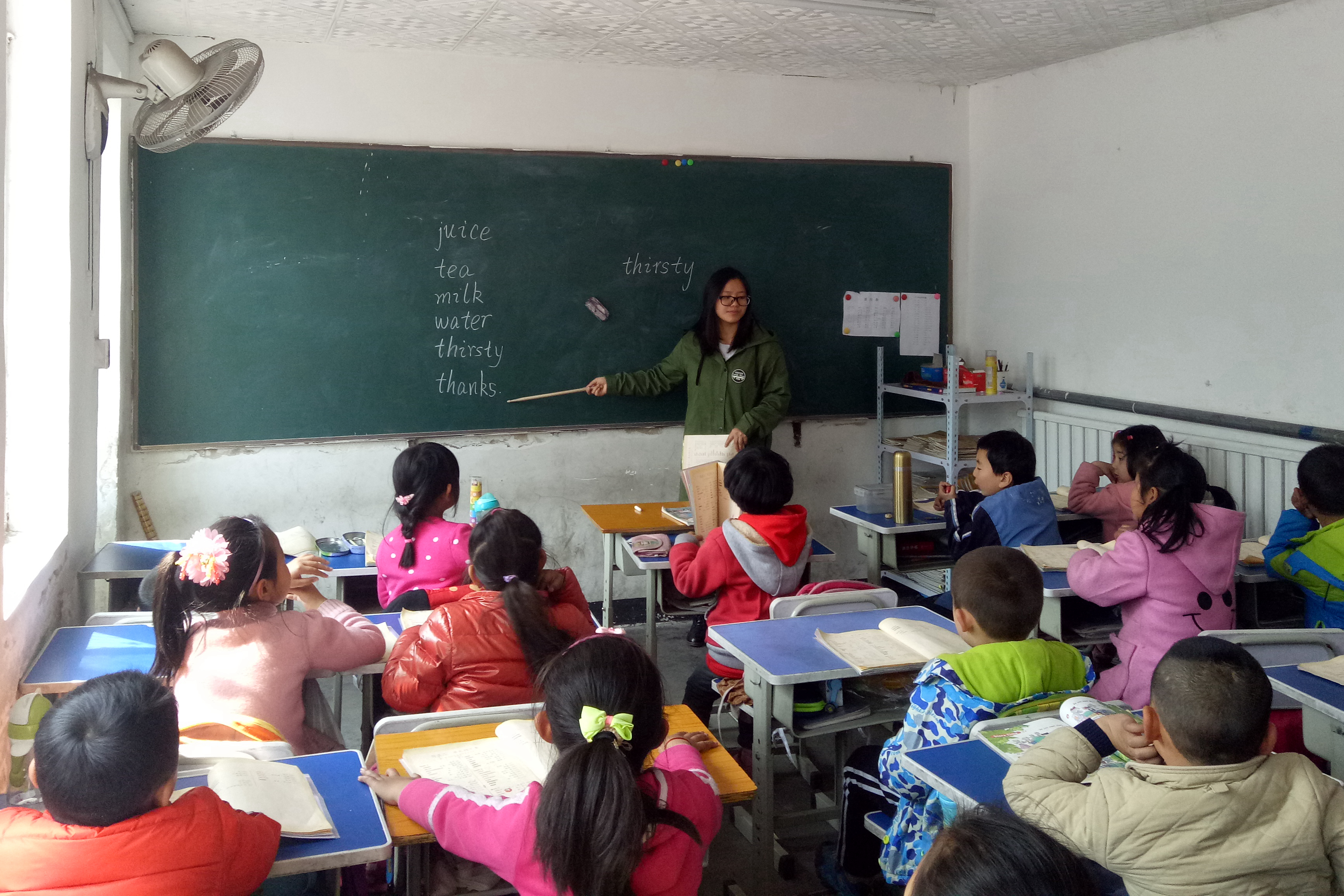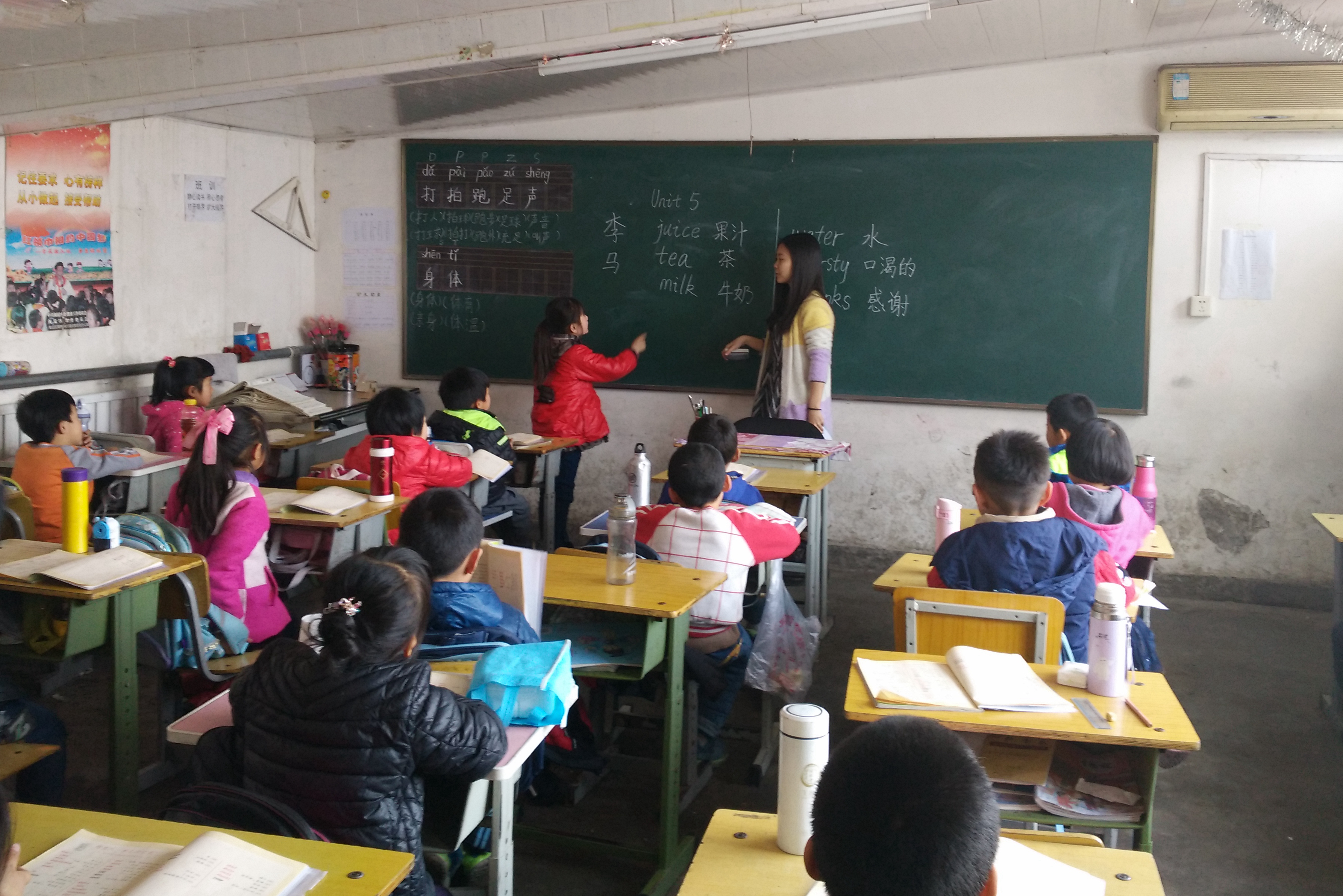 王春阳和李梦娟同学负责为一年级的两个班级讲授英语课程。本次授课主要是教员工们认识单词,由于孩子们正在读一年级,没有学习过二十六字母和音标,所以志愿者们的任务就是教会孩子们熟读第五单元的单词。志愿者们耐心教读,员工们认真听讲,当遇到不会读的单词时,他们会勇敢地提出,志愿者们一遍一遍地重复教他们识记,直到整个班级的员工们都会读为止。