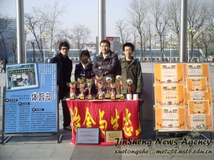 今天的五环广场是体育的乐园,许多学院的体育部以及学校体育类的社团都在这里展示着自己的风采,其中冶金学院体育部就是其中独具特色的一个。激情踏实的冶金人在体育上所取得的成绩有目共睹,而展台上林立的奖杯与铺满的奖状是冶金人热爱体育的最好见证。这些都给经过参观的人留下了非常深刻的印象。