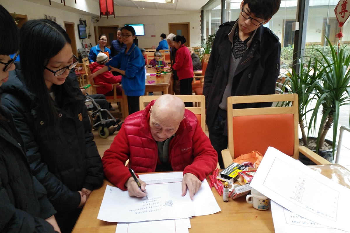 队员们还注意到,旁边有一位爷爷在静静地写字,看到大家好奇的眼神,爷爷提出要为我们写字。虽然爷爷的动作缓慢,但字写的却是刚劲有力。队员们被老人们活到老、学到老的精神深深地触动了。