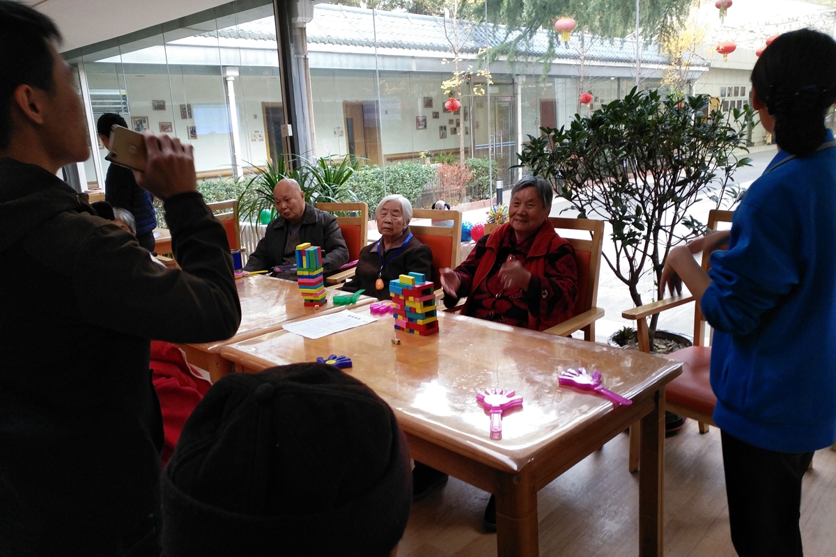 同学们打扫完院子以后,老人们也结束了午休时间,护工把老人们带到活动大厅。志愿者们提出要为奶奶们唱歌,敬老院的气氛似乎也因为队员们的到来变得活跃起来。一首接着一首,护工为队员打着节拍,老人们的脸上也露出笑容,敬老院里其乐融融。
