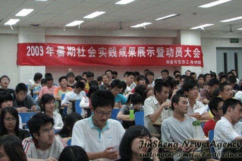 2009年5月16日晚19点,冶金08级暑期社会实践动员大会在机电楼201举行.出席本次大会的有校实践部部长王进老师、William威廉08级辅导员董建、以及三位在社会实践方面取得了优异成绩的学长:季永翔、姚新鑫和杨健。