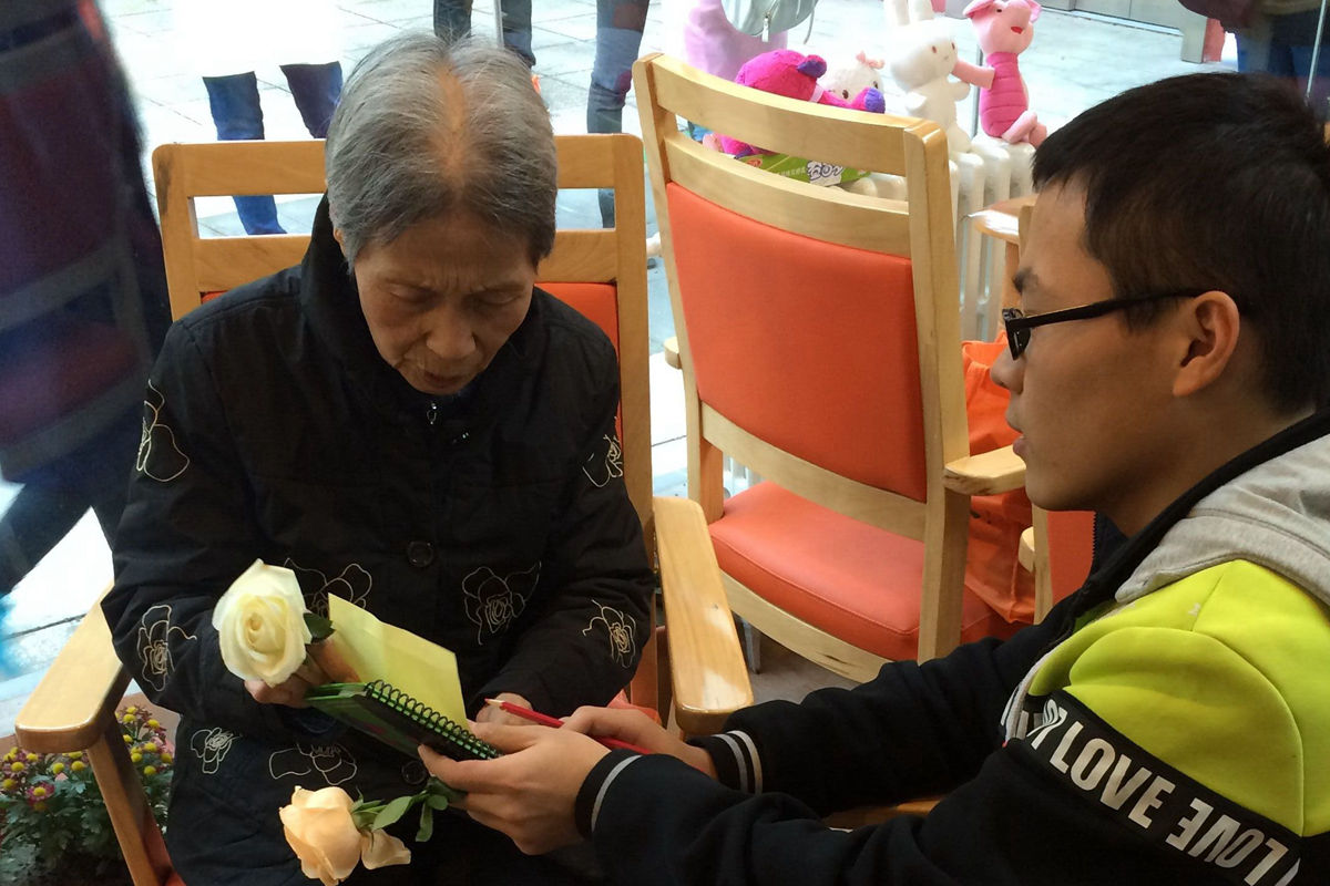 等到老人午休之后,同学们在工作人员的带领下进入房内,与老人进行互动。有的同学陪老人聊天,听他们以往的奋斗岁月;有的同学整理花朵,拿下来给老人们,看着他们那一张张满足的笑容;有的同学与老人探讨一些历史问题等等。在这时间段内,同学们了解到了该敬老院目前的养老状况、一些亟待解决的养老问题以及老人们对目前养老方式、服务机构、硬件设施和精神需求方面的意见和建议。快乐的时光总是短暂的,与老人会别后,志愿者回到学校。