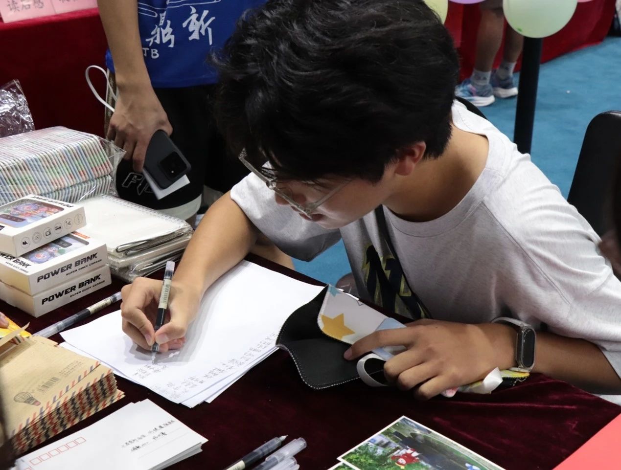 投壶游戏结束,明信片承载着期许,一句句“加油”、“前途似海,来日方长”、“纵马踏花向自由”与接下来大学四年的自己共勉。