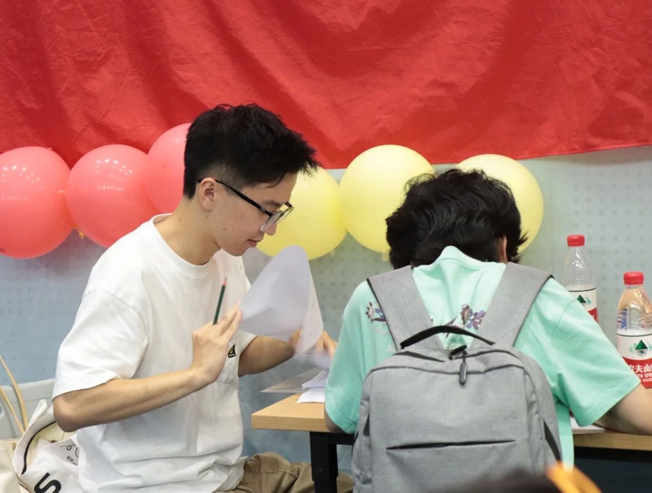 交完档案,走绿色通道的新生在辅导员的帮助下填表,一句句亲切的问候,是学校、学院对员工最深的爱。