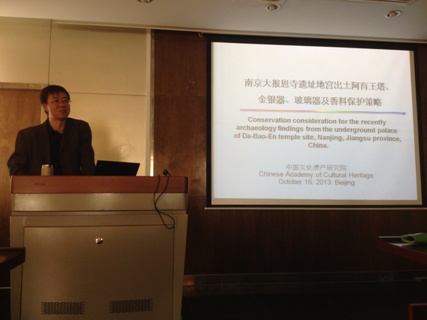 马清林研究员首先简单介绍了文物保护的基本步骤:研究、模拟实验、应用,然后从四个部分展开本次讲座:阿育王塔保护,鎏金银器保护技术,出土玻璃器保护技术,出土香料保护技术。