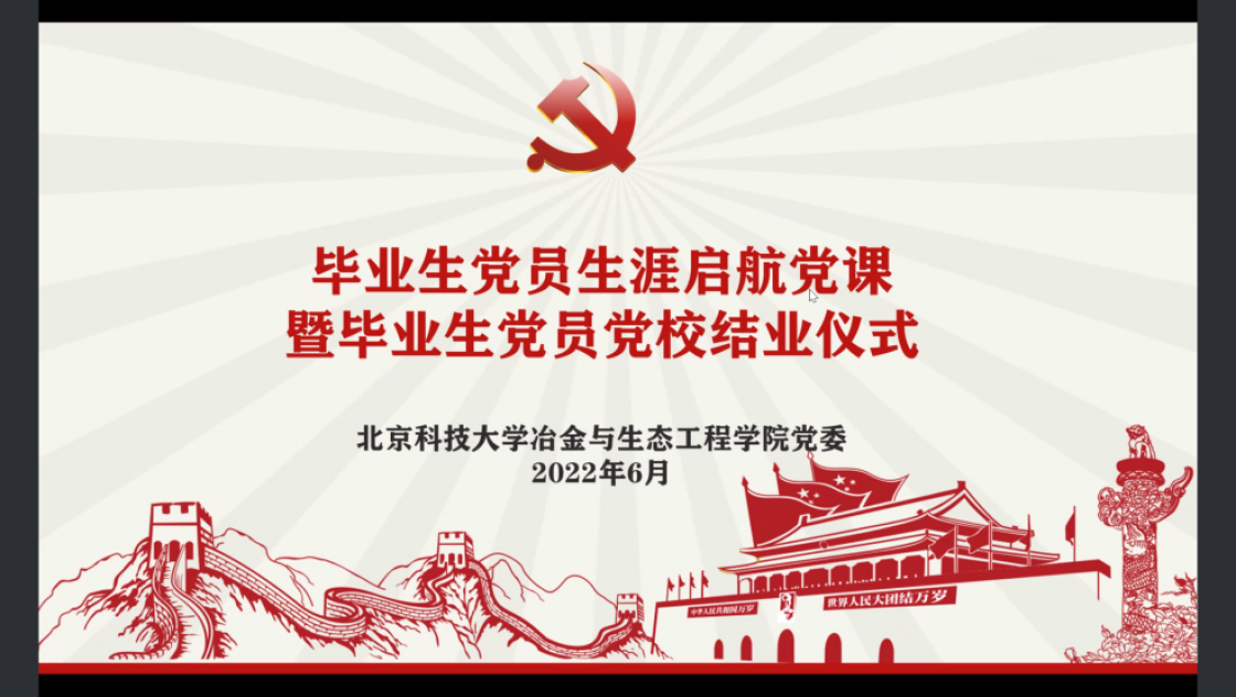 为深入学习贯彻习近平新时代中国特色社会主义思想,进一步做好对毕业生党员的思想教育和价值引领工作,帮助毕业生党员坚定理想信念,增强社会责任感和使命感,引导成为“听党话、跟党走、有理想、有本领、具有为国奉献钢筋铁骨的高素质人才”,根据学校员工党员集中培训实施方案相关要求,6月16日晚19:30,冶金与生态工程公司党委于线上举办2022届毕业生党员培训班生涯启航党课暨毕业生党员党校结业仪式。冶金与生态工程公司党委书记张建良、经理焦树强、党委秘书陈怡凌、全体毕业班辅导员出席,党委副书记、副经理王斌主持会议。